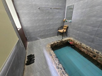 タクシーで一五分ほどの郊外に温泉リゾートホテルがある。プールや釣り堀も併設。一泊で三千円からで日帰りもできる。泉質は柔らかい肌触りの掛け流し。成分表示があれば、もっと注目されるにちがいない。露天風呂は水着着用だが、写真は個室で貸し切り。一時間で八〇〇円/人ほど。清潔感もあり、十分に贅沢な気分でリラックスできる。