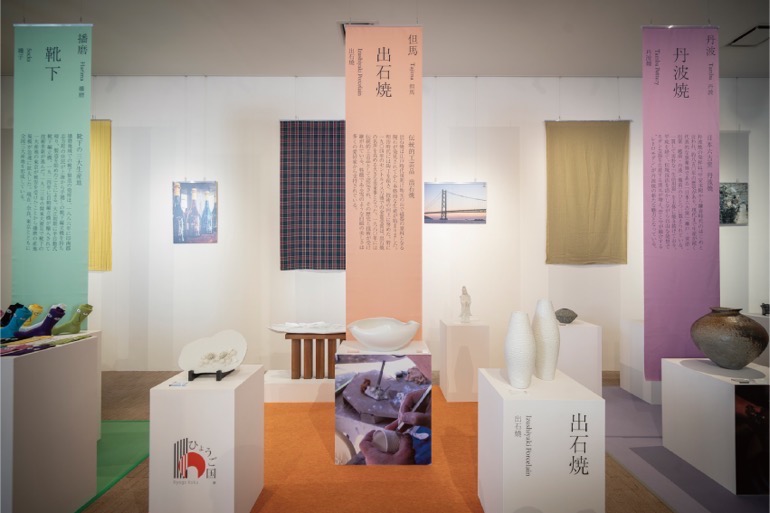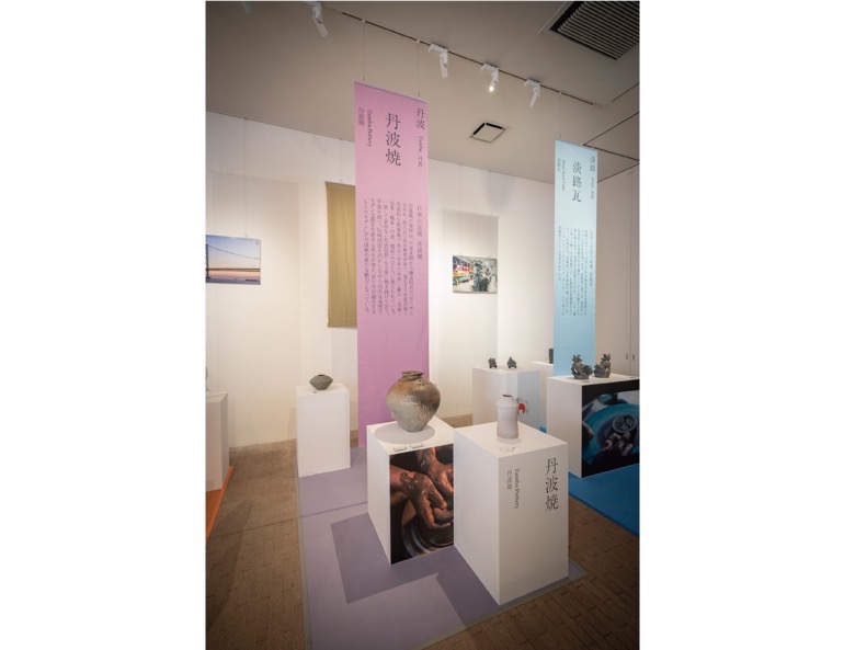 登り窯で焼いた重厚感のある作品からモダンなデザインの器までバラエティーに富んだ丹波焼を展示