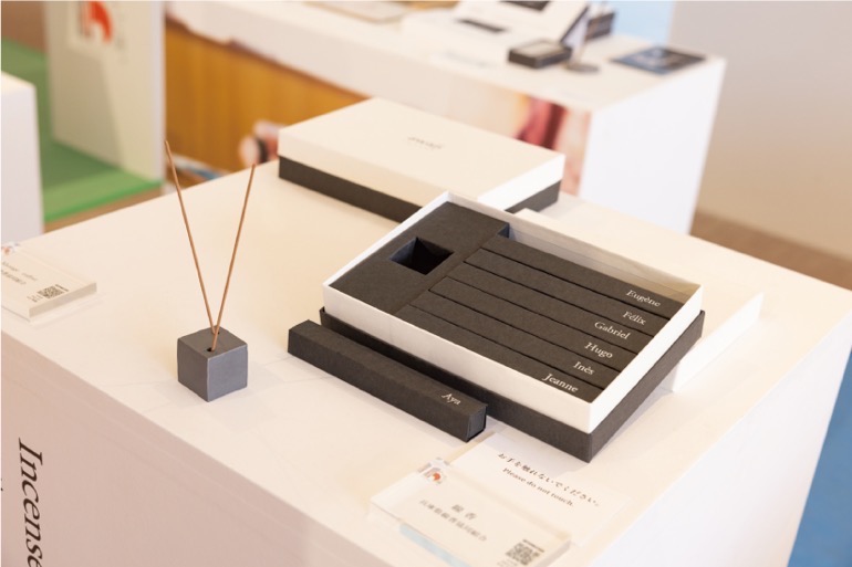 海外でも話題のルームフレグランスとして、お洒落なパッケージ入りの線香がズラリ。なかには同じ島で作られた淡路瓦の廃材を活用した香立付きなどの線香なども