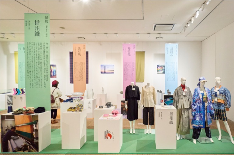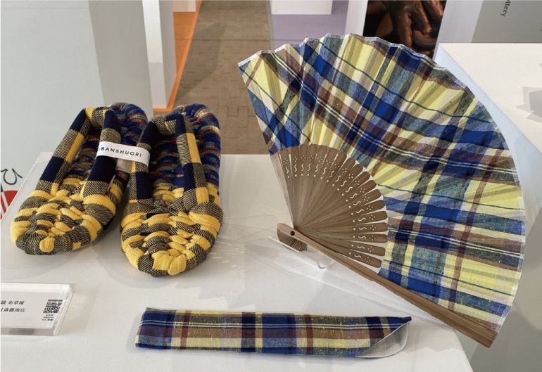 ストールやシャツほか、犬のカタチの眼鏡スタンドや布の織り紙など、個性豊かな製品が勢ぞろい。扇子や布草履は、ビンテージ生地を活用するなど、環境にも配慮