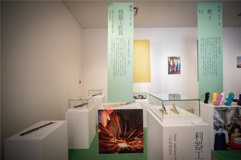 伝統的な方法によって製造された、鋭い切れ味を誇る刃物や手道具などを、火花が散る迫力の鍛造作業の写真とともに展示