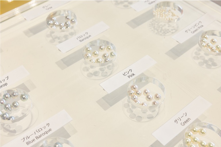 ゴールドやピンク、グリーン、ブルーなど多様な種類のパールとパールネックレスの展示で、神戸が誇るパール加工技術を表現