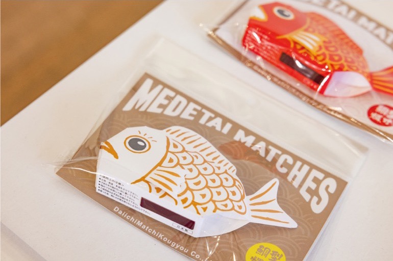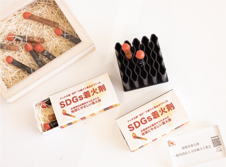 レトロ缶入り、鯛型などユニークなマッチの数々。播州そろばんの玉製造時の木屑や淡路島線香の粉の再利用など県内の廃材から生まれたSDGs着火剤も展示