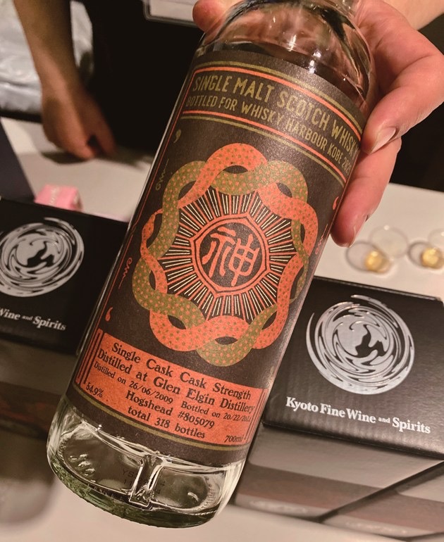 「ウイスキーハーバー神戸 オリジナルボトル」を今年は2種用意。写真は「Kyoto Fine Wine and Spirits」のブースで先着順に限定販売の「グレンエルギン14年」。抽選販売は本坊酒造、マルス津貫蒸溜所の「津貫2021バーボンバレル ヘビーリーピーテッド」。