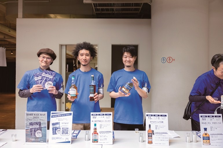 本坊酒造の長野県の駒ヶ岳蒸溜所、鹿児島県の津貫蒸溜所、屋久島エージングセラーと異なる環境を持つ3拠点のウイスキーを飲み比べできる。「神戸はお客さんの幅が広く、色々な人との出会いがある。また運営者が色々気遣ってくれ、イベント終了後の打ち上げも盛り上がるので、毎回楽しみ(笑)」とブレンダーの草野辰朗さん(下の写真左)。