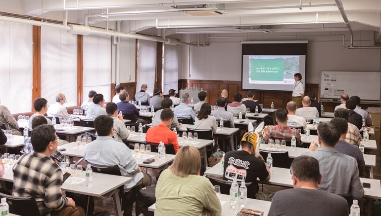 別フロアでは酒造会社や蒸溜所の協力で有料セミナーを開催。写真はべンチャーウイスキー、吉川由美さんによる、2004年に創業した同社の20周年記念セミナー。5種のカスクサンプルのテイスティングと共に楽しむ内容で、20th記念ボトルの紹介&試飲も!