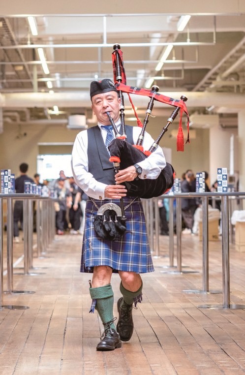 スコットランドの伝統楽器バグパイプの生演奏で会場を盛り上げ!演奏は関西を中心に活躍される山形倫弘さん。バグパイプバンド「ラムゼイ・パイプバンド」のメンバーで、もちろん大のウイスキー好き。