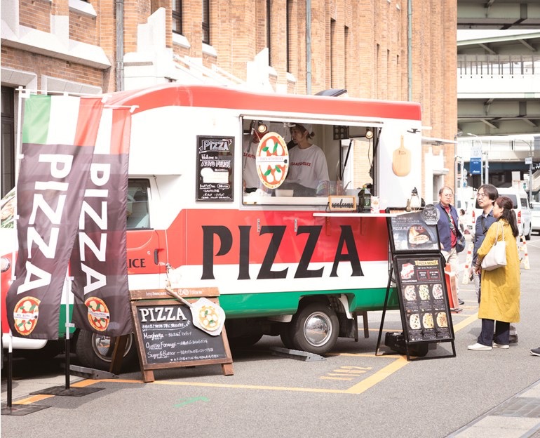 タコスやカレー、ハンバーガーなど、多彩なキッチンカーがKIITOの駐車場にスタンバイ。出来立てアツアツの食事やおつまみを敷地内で入手できるのが嬉しい。