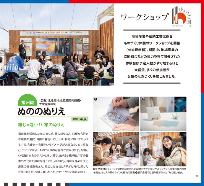 地場産業や伝統工芸に係るものづくり体験のワークショップを開催(参加費無料)。期間中、地場産業の協同組合などの協力を得て開催された体験会は予定人数がすぐ埋まるほど大盛況。多くの参加者が兵庫のものづくりを楽しみました。
