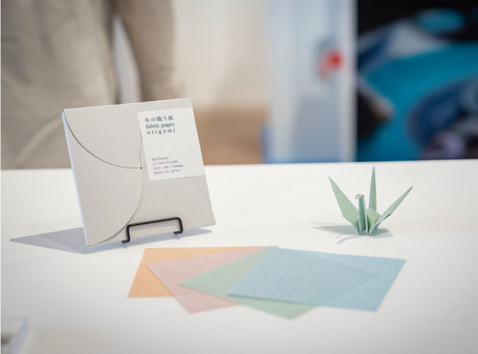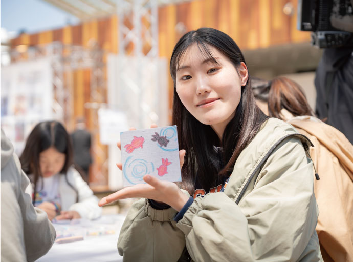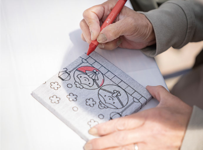 播州織を活用した布の塗り絵。鯉のぼりなど、15種から好きな絵柄を選択、自由に着色して仕上げ、自宅に飾ってもらえる内容。「織物=衣類というイメージがあるなか、ぬり絵など、アイデアによりものづくりの可能性が広がります。万博という海外からのゲストも多い場で、ぬりえや織り紙、“和”の日本の文化にも興味を持ってもらえれば」と講師を務めた大化産業の高橋直也さん。参加した女性は「子ども時代、親しんだぬりえを思い出し、楽しかった」と仕上がりに満足の様子。