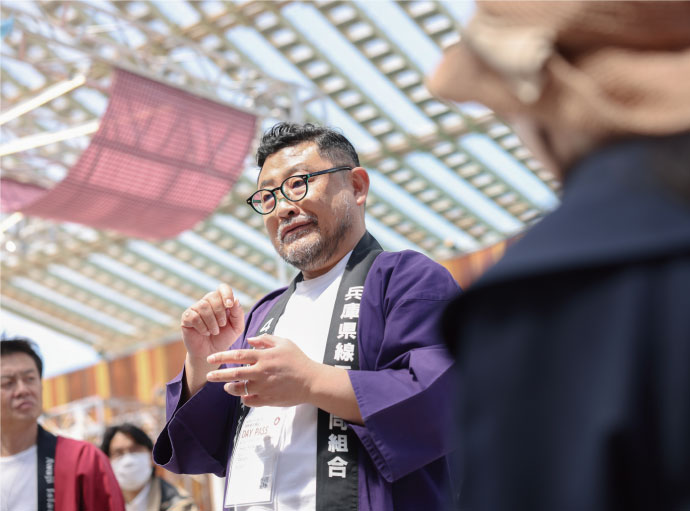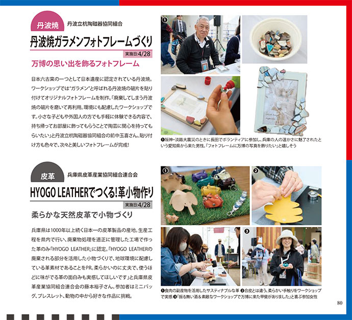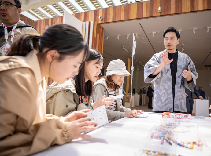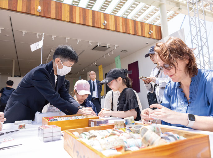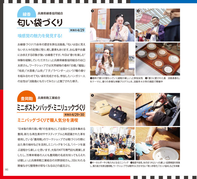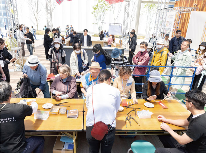 “日本製の質の高い鞄”の生産地として全国から注目を集める豊岡。新たな再生素材やサスティナブルと再認識された革を使用している「豊岡鞄」のワークショップでは鞄づくりの際に出た革の端材などを活用しミニバッグをつくる。「パーツを選ぶ過程から楽しいと思います。大阪のKITTE専門店も開業しましたし、万博来場者の人にも豊岡鞄の名前を知ってもらえれば嬉しい」と兵庫県鞄工業組合の天野良昭さん。2日にわたる開催ながら整理券が即なくなるほどの盛況ぶり。