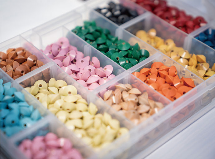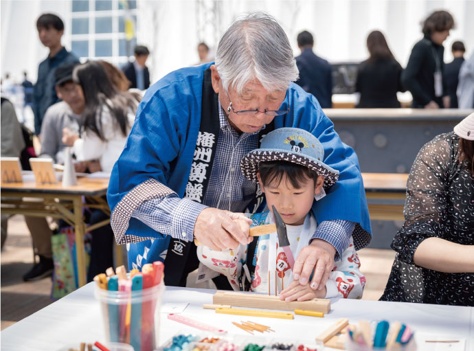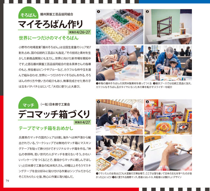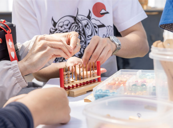小野市の地場産業「播州そろばん」は全国生産量のシェア約7割を占め、国の伝統的工芸品にも指定。「その技術と素材を生かした新商品開発にも注力し、世界に向けた新市場を開拓中です」と語る播州算盤工芸品協同組合の宮永英孝さんの指導のもと、参加者はピンクやブルーなど、カラフルな枠や玉を選んで組み合わせ、世界に一つだけのマイそろばんを作る。そろばんの作り方や使い方の紹介もあり、無事完成させた男の子は玉をパチパチとはじいて、「大切に使う!」と大喜び。
