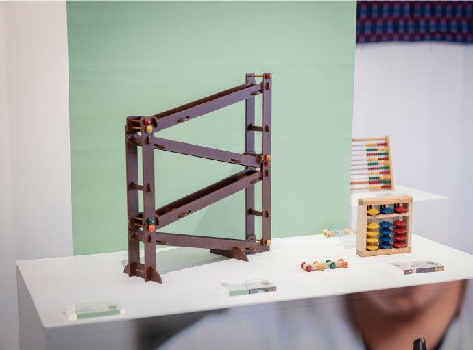 展示ブースでは伝統工芸品に加え、カラフルなそろばん玉がタイヤになった木の車を転がすスライダーを紹介