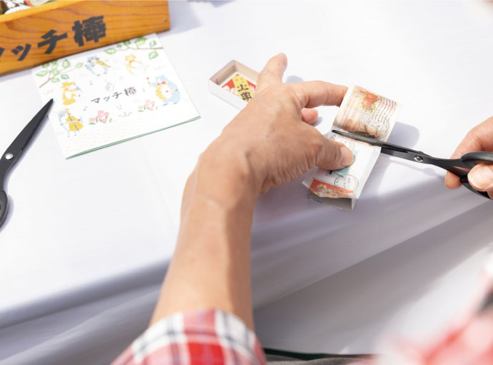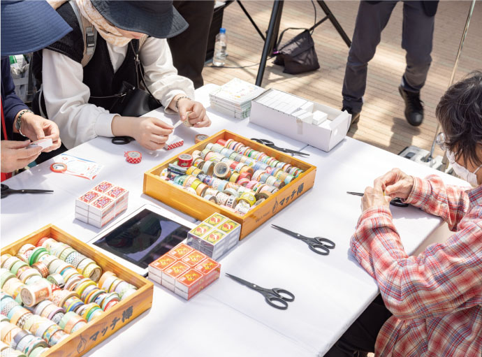 兵庫県のマッチの国内シェアは8割。海外へは神戸港から輸出されている。ワークショップでは無地のマッチ箱にマスキングテープを貼って飾り付けてオリジナルマッチ箱を作る。「神仏の参拝時、若い世代の人がマッチを使えないそう。かわいいパッケージをつくることで、普段からマッチに親しんでほしい」と日本燐寸工業会の松本和久さん。60種以上そろうマスキングテープを自分好みに貼り付ける作業はシンプルだからこそこだわりたいと皆、熱心に作業に取り組んだ。