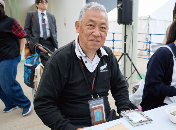 阪神・淡路大震災のときに長田でボランティアに参加し、兵庫の人の温かさに魅了されたという愛知県から来た男性。「フォトフレームに万博の写真を飾りたい」と嬉しそう