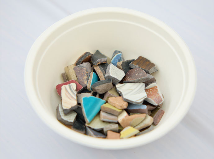 日本六古窯の一つとして日本遺産に認定されている丹波焼。ワークショップでは“ガラメン”と呼ばれる丹波焼の破片を貼り付けてオリジナルフォトフレームを制作。「廃棄してしまう丹波焼の破片を磨いて再利用。環境にも配慮したワークショップです。小さな子どもや外国人の方でも手軽に体験できる内容で、持ち帰ってお部屋に飾ってもらうことで陶芸に関心を持ってもらいたい」と丹波立杭陶磁器協同組合の前中玉喜さん。貼り付け方も色々で、次々と美しいフォトフレームが完成!