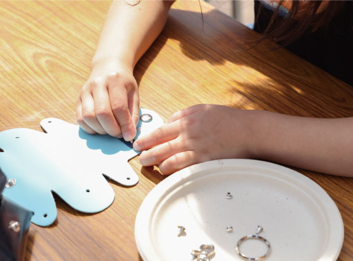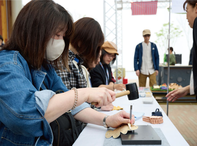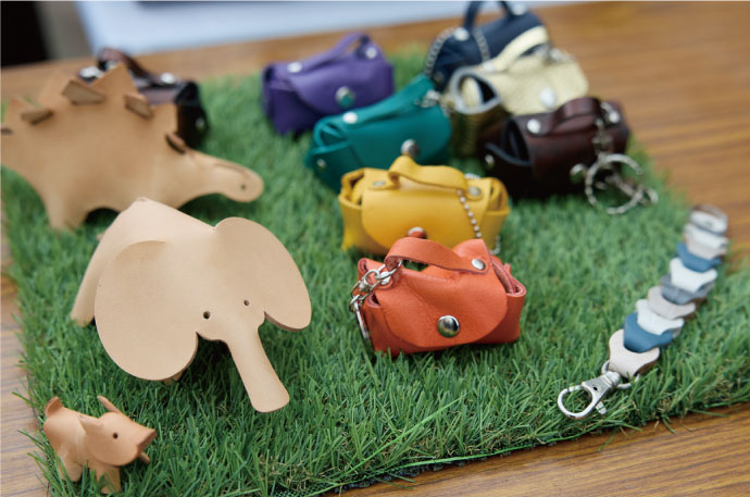 兵庫県は1000年以上続く日本一の皮革製品の産地。生産工程を県内で行い、廃棄物処理を適正に管理した工場で作った革のみ「HYOGO LEATHER」に認定。「HYOGO LEATHERの廃棄される部分を活用した小物づくりで、地球環境に配慮している革素材であることをPR。柔らかいのに丈夫で、使うほどに味がでる革の面白みも実感してほしいです」と兵庫県皮革産業協同組合連合会の藤本裕子さん。参加者はミニバッグ、ブレスレット、動物の中から好きな作品に挑戦。