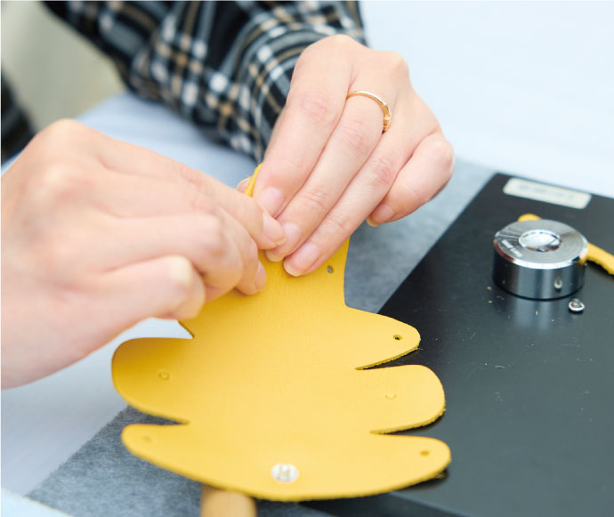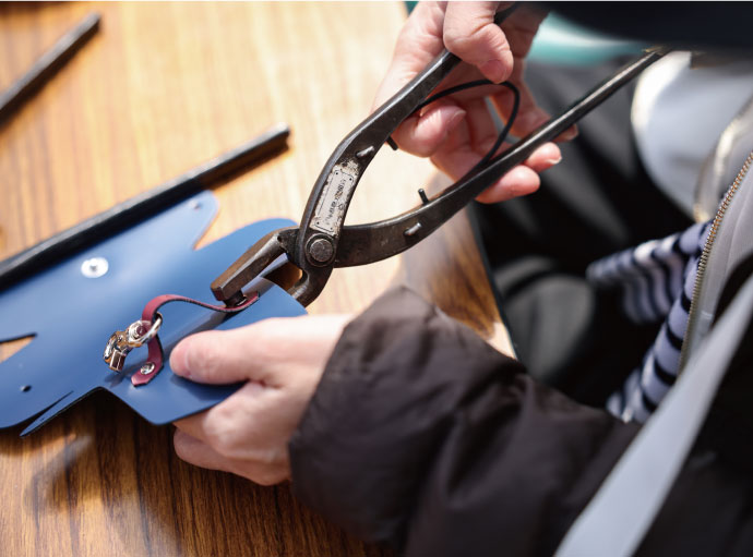 強度や染色、糸のほつれといった厳しい品質検査を実施し、質の高さを誇る豊岡鞄。ワークショップでは鞄作りに欠かせない「取っ手取付」「カシメ留め」などを体験