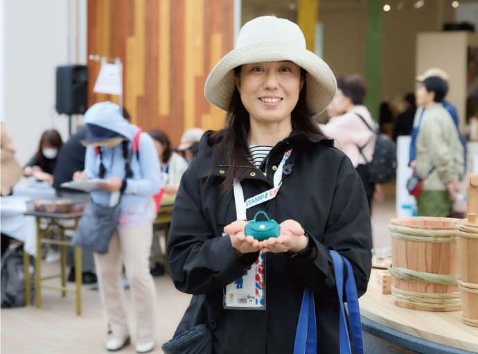 「振る舞い酒&素敵なワークショップで万博に来た甲斐がありました」と喜ぶ参加女性