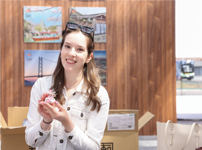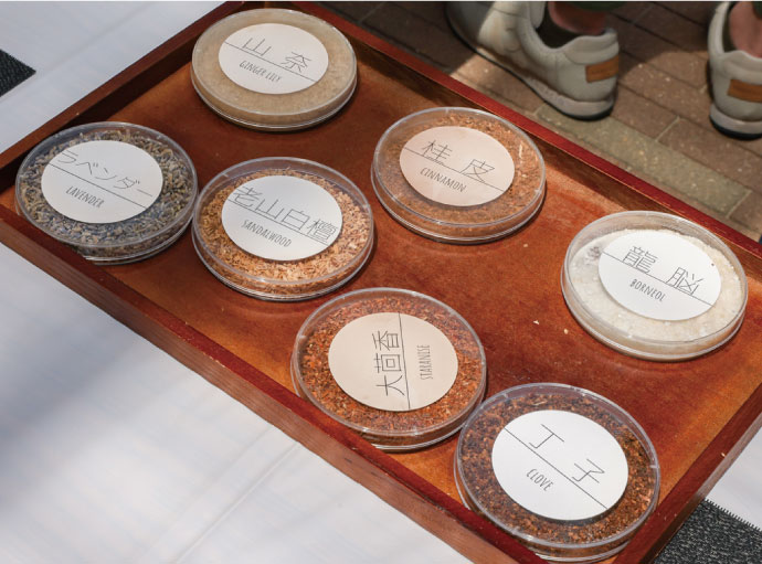 お線香づくり175余年の歴史を誇る淡路島。「匂いは目に見えないが人々の記憶に残り、癒し要素もあります。お仏壇やお墓にお供えする印象が強いお線香ですが、今日は“香りを楽しむ”体験を経験していただきたい」と兵庫県線香協同組合の谷口太郎さん。ワークショップでは天然植物の香料「白檀」「龍脳」「桂皮」「大茴香」「山奈」「丁子」「ラベンダー」という7種の香りを組み合わせて匂い袋を完成させる。参加したハンガリー人の女性は「淡路島にも行ってみたい」と魅了された様子。