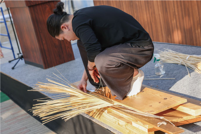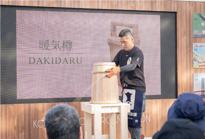 日本酒の酒母づくりに欠かせない道具「暖気樽」造りの実演。「暖気樽」とは湯たんぽのような器具で、樽に熱湯を入れて酒母を攪拌し、温度を徐々に上げることで米の糖化を促進させるもの。当日は剣菱酒造の中野勝さんが細く割いた真竹を輪っか状に結って、樽の板をしめる様子を披露。経験と感覚で樽の全周を把握した中野さんが10mほどもある真竹をビュンと飛ばしては引き寄せ、ねじり巻きでしめていく。積み重ねてきた経験が成せる技に観客は拍手喝采でした。