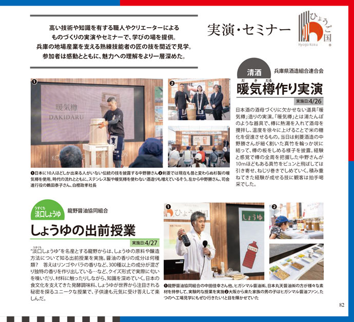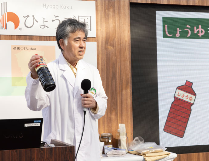 “淡口しょうゆ”を名産とする龍野からは、しょうゆの原料や醸造方法について知る出前授業を実施。醤油の香りの成分は何種類? 答えはリンゴやバラの香りなど、300種以上の成分が混ざり独特の香りを作り出している…など、クイズ形式で実際に匂いを嗅いだり、材料に触ったりしながら、知識を深めていく。日本の食文化を支えてきた発酵調味料、しょうゆが世界から注目される秘密を探るユニークな授業で、子供達も元気に受け答えして楽しんだ。