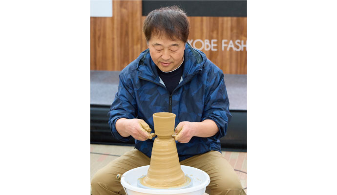 丹波立杭陶磁器協同組合の森本芳弘さん(丹山窯)が最初に実演。軽快なトークとともに匠の技を披露