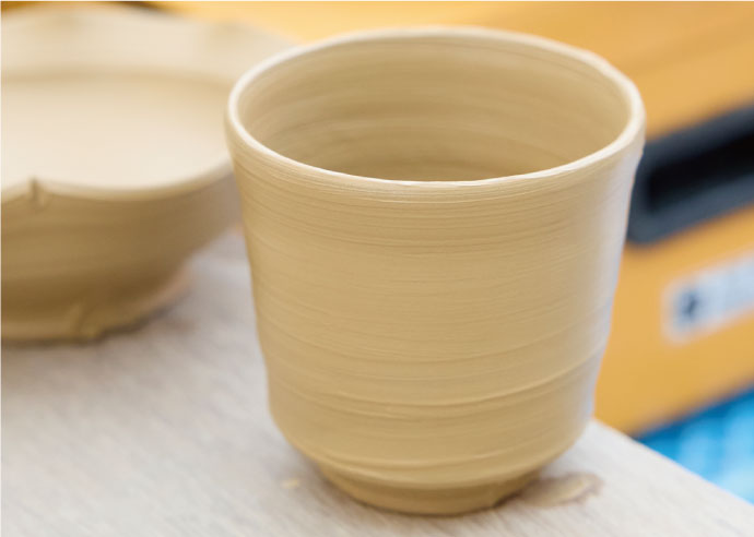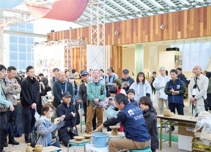 当日は3名の窯元が順に電動ロクロを実演。組合で生産している粘土を菊練りしたあと、粘土の塊からお皿や徳利など、次々と形づくっていく様を披露。雨が降り、花冷えする日だったが、大勢の来場者が匠の技術を間近で見学できて感動。「やってみたい!」と挑戦する子どもが登場するほど大いに盛り上がった。