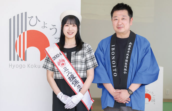 播磨で600年間受け継がれる伝統の手延べ製法を守ってきた兵庫県手延素麺協同組合。当日は職員の天川亮さんとミス揖保乃糸の油谷美咲さんが場を盛り上げた