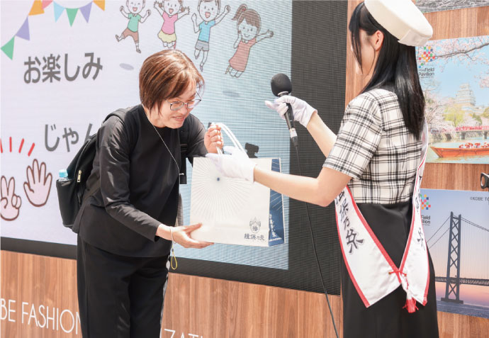 夏の風物詩、兵庫県が全国一位の生産量を誇る日本の伝統食「手延そうめん」の魅力を、2024年ミス掃保乃糸の油谷美咲さんのステージトークやアレンジした撮保乃系の試食を通してPR。帯状の麺生地を数本合わせて1本にしたものを、さらに数本あわせて1本に…と繰り返し、熟成を重ね、麺に縒りをかけながら細く延ばしていく手延製法が、瑞々しく、コシがあり、茹でてものびにくい味わいを実現。そんな製法やこだわりを学んだあとは、豪華詰め合わせセットをかけたジャンケン大会。白然の戦いが繰り広げられた。