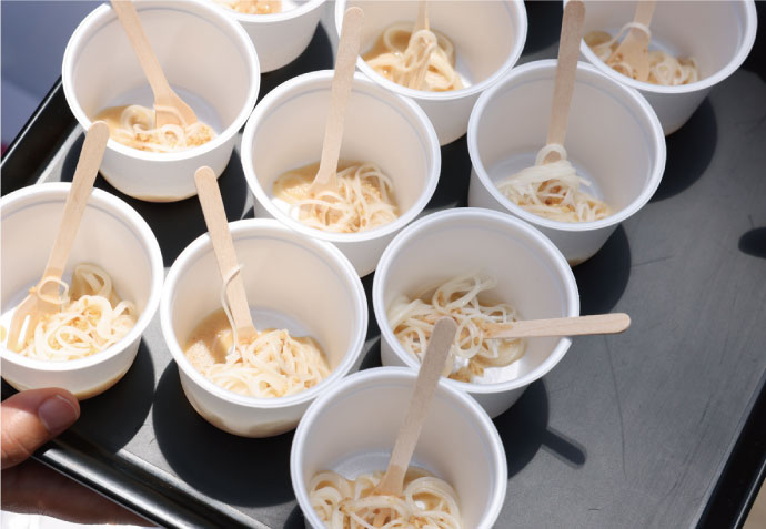 試食は揖保乃糸特級品をごま風味のぶっかけつゆでアレンジしたもの。海外からのお客様にも受け入れられやすい食べ方や味で提供することで、日本の伝統食「そうめん」をカジュアルに伝える