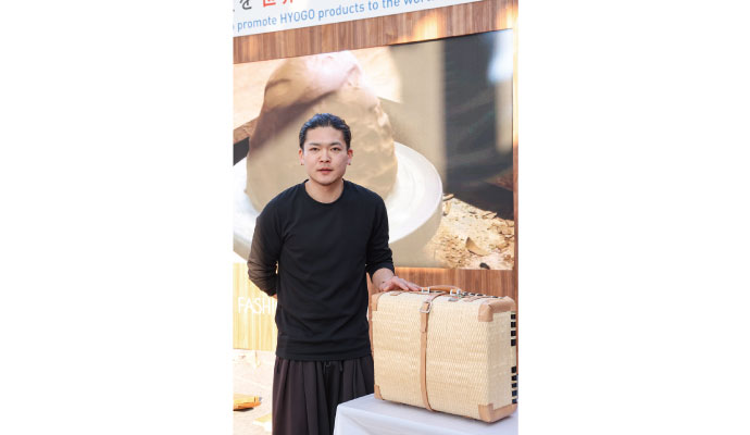 「柳行李」とは豊岡で伝統的に作られてきた「豊岡杞柳細工」の代表製品。豊岡かばんの原点であり、1300年以上の歴史を誇る日本の伝統工芸品。コリヤナギを使って柳行李を編む実演をしたのは豊岡杞柳細工ブランド「KORI ANRI JAPAN」の加藤かなるさん。皮を剥いだコリヤナギを組んで板で押さえ、指で1本ずつ上下に分けた間に麻糸を通す。体をかがめて編むのは体力も根気もいる作業であることが、ひしひしと伝わってくる迫力ある実演だった。