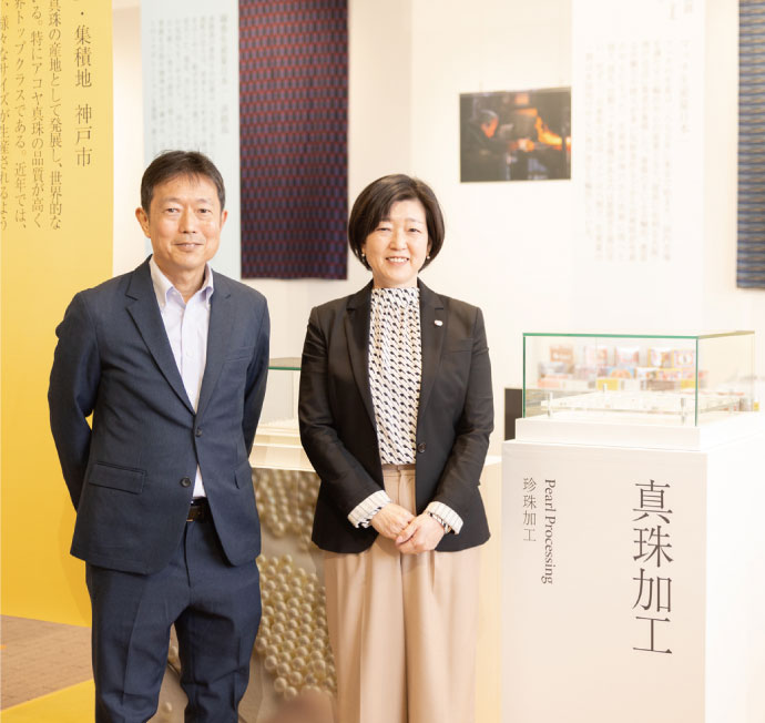 「真珠は鉱物資源由来の宝石類に比べ、より循環型で環境に配慮した宝飾品。世界的に評価されている持続可能性なジュエリーです」と日本真珠輸出組合の倉本達さんと伊地知由美子さん