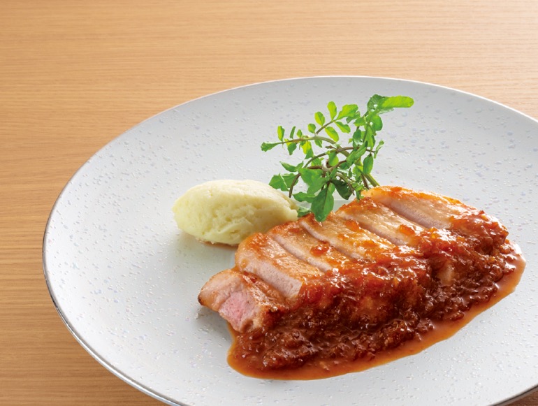 ランチはコース仕様で2,800円~。8種類の洋食からメインメニューを選び、スープ、サラダ、パンまたはライスがつく。写真の彩美牛のヘレビーフカツレツの場合、ランチコース3,600円、夜は単品(3,000円)でオーダーできる