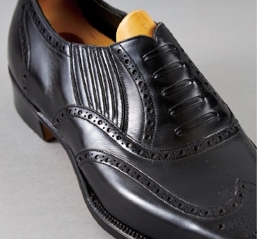 東京でアクティブに仕事されるI氏のオーダーは、イミテーションシューレースが付いたサイドエラスティックシューズ。アッパーのパーフォレーションやヒール前部へ落ちるスロートラインなど、ディテールのバランスにこだわり、英国調アンダーステイトメントなスリッポンを華やかな印象へと昇華。レイジーマン=怠け者の名に反してドレス感が高いため、タイドアップスタイルはもちろんジャケットスタイルにもマッチ。ビジネスシーンを洒脱に演出します。