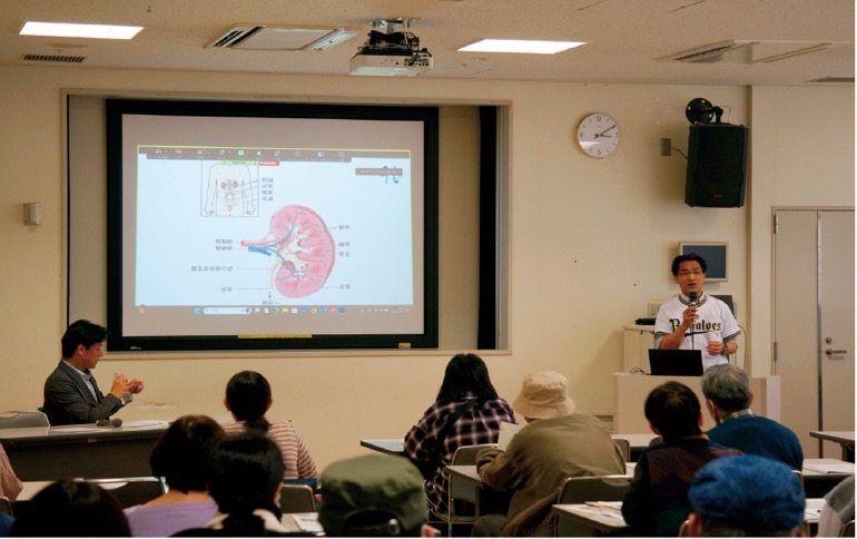 米倉 冒頭に神戸大学大学院医学研究科腎臓内科准教授の藤井秀毅先生より腎臓やCKDについての解説があり、これを受けて「腎臓を守ろう」を主題にそれぞれの専門職の視点から4人の講師にお話いただきました。まず、神戸市立医療センター西市民病院管理栄養士の赤沢尚美さんが「元気に過ごすために食事からできること」を演題に、食事のバランスや減塩のための調理のポイントをわかりやすく解説しました。続いて兵庫県立西宮病院透析室看護師の小谷亜由美さんは、「看護師の立場から伝えたいこと」と題して早期発見治療の大切さを訴え、西宮市独自のCKD予防連携事業も紹介しました。明石医療センター薬剤師の岩崎克也さんは「お薬と健康食品・サプリメント」をテーマに腎臓とお薬の関係について解説し、腎機能が低下している場合には市販薬はもちろん、健康食品やサプリメントを摂取する際にも必ず医師や薬剤師に相談しましょうと注意を促していました。最後に兵庫県立はりま姫路総合医療センター腎臓内科診療科長の中西昌平先生が「検診と生活習慣のポイント」を演題に、健診やCKDの診断と治療、腎臓が悪くなった際の生活習慣の注意点などのお話をされました。