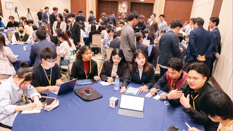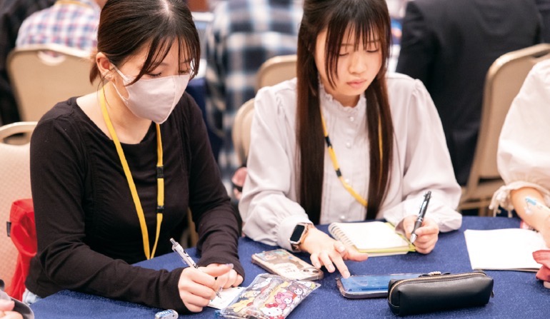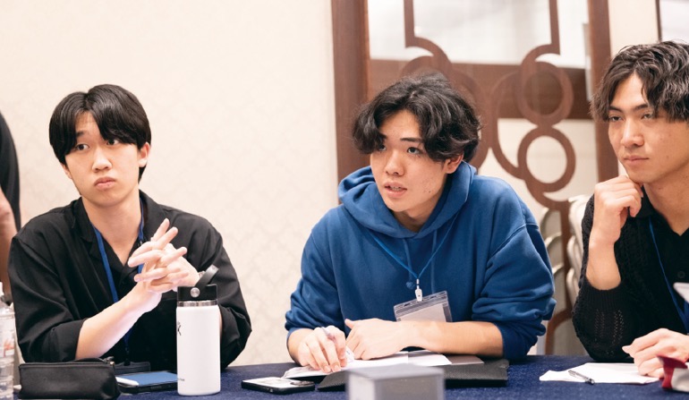 各テーブルで質疑応答・フィードバック。熱心に聞き入る学生たち