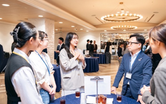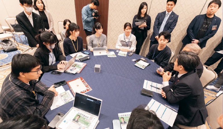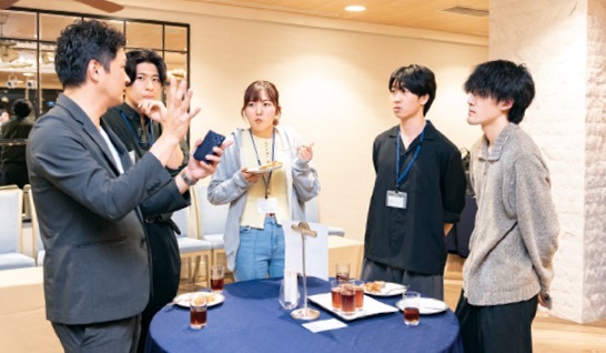 プレゼン後は企業・団体からの質疑応答およびフィードバックが行われ、内容への共感や掘り下げた質問、具体例についての質問が投げかけられ、時には厳しい苦言も呈された。続いて、学生グループのテーブルを企業・団体担当者、議員がローテーションで回り質疑応答・意見交換が行われ、学生たちはメモをとりながら熱心に耳を傾けた。会場を「海王」に移して会食をしながら行われた交流会では学生たちの緊張もほぐれ、率直な意見交換の場となった。