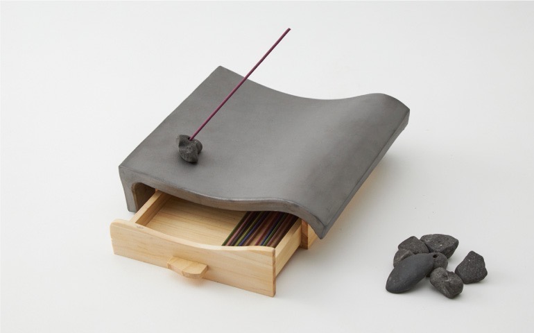 淡路瓦と「家」との繋がりを探求するなか、淡路島の線香に着目し、香りの文化を瓦に託した。淡路瓦の造形美が活きる線香の台座に、下部には線香など小物の収納スペースも。瓦を積み重ねることで伝統的な屋根の風景を思わせる佇まいを生み出しながら、基台には不良瓦を粉砕・再生した瓦を用いるなど、環境にも考慮。