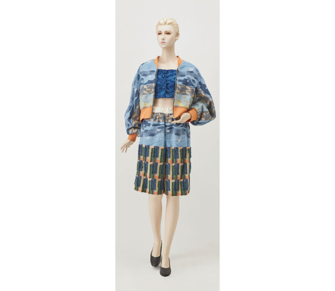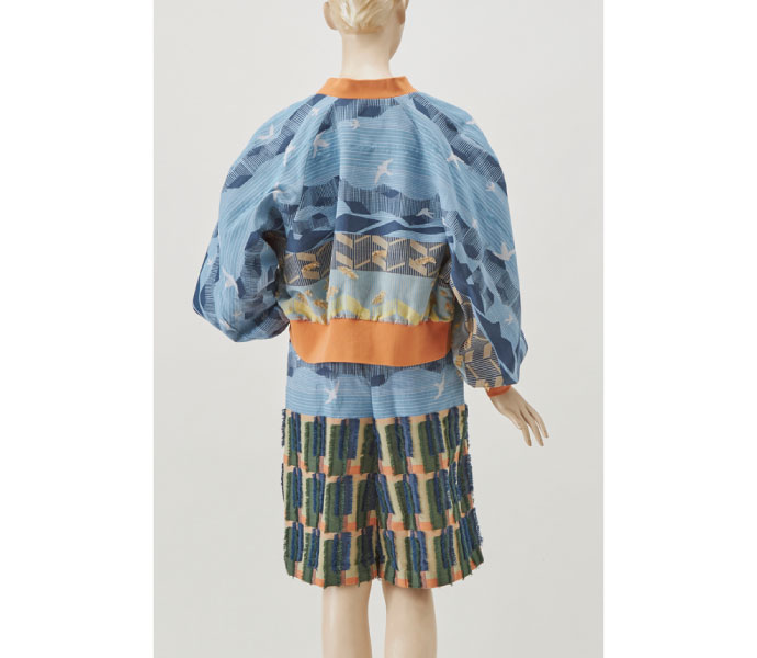 「風土」は地理環境だけでなく、文化の根源と言えるもの。空、海岸線、島の隆起など、島国の自然の景色をデザインのインスピレーションとして活用し、上下のセットアップを完成させた。ウェーブ式のカッティングを活用して海の流動を、グラデーションの色彩、海と空に光が差すような色調に加えて、棚田や稲穂など農の要素もプラスして、自然と文化の融合を表現している。