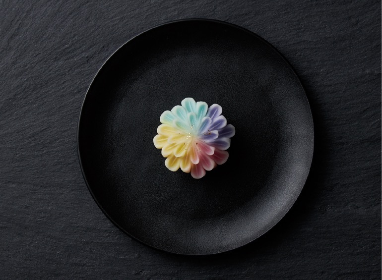 大輪の花が夏の夜空を彩ります。赤、黄、青、紫で染めたねりきりに、白色のねりきりを重ねることで、花火の朧げな光景を表現しています。ひと時でも夏の暑さを忘れたいものです。