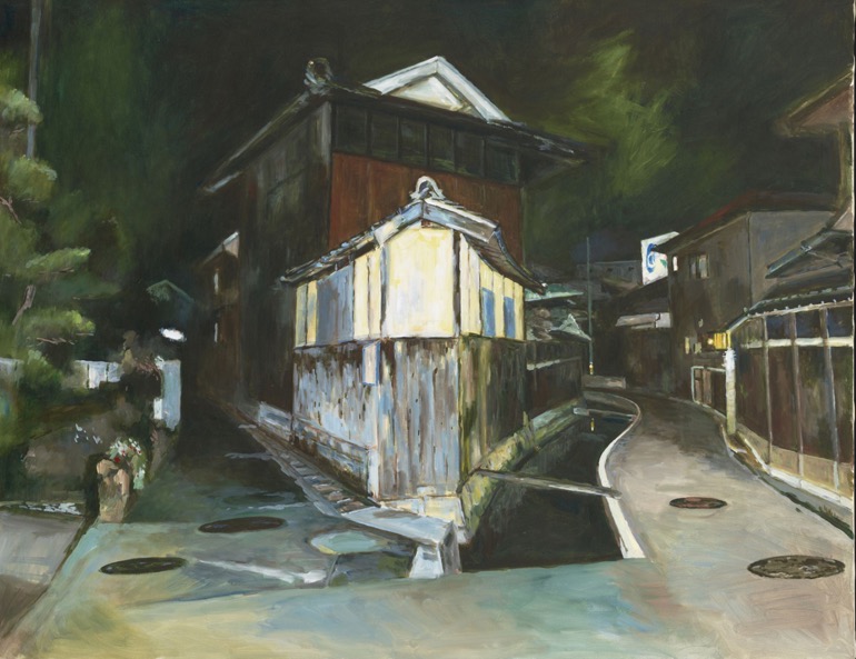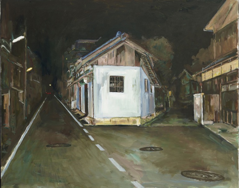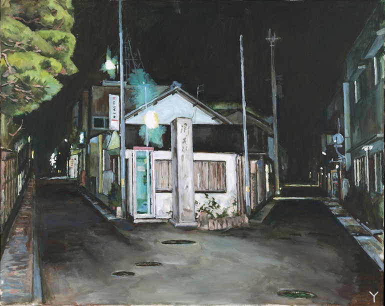 これこそ芸術的な風景です。これは大発見だと叫んだ僕は、予定していた日程を変更して、町の画材店からキャンバス、筆、絵の具を購入して、早速この絵を描きました。出来上がると同時に、もしや他にもこのような場所があるかもしれないと、再び町に出掛けました。すると、至る所に、この三叉路があるじゃないですか。そして、もう1日滞在を延長して、いくつかの場所の写真、それも全て夜景を撮りました。そしてその場所を「Y字路」と命名しました。それ以降、日本のY字路を訪ね、現在は200点近く描いたのではないかと思います。