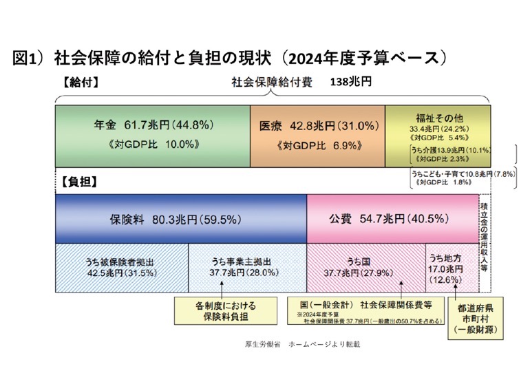 生島 社会保障給付費は2024年度予算ベースで138兆円、医療費は42.8兆円とその中の31%を占めています(図1)。社会保障のための「公費」は国の歳入の大きな部分を占めており、給付と負担のバランスについて不断の検討の必要性がうたわれています。一方で国民負担率を対GDP比で諸外国と比較すると、日本は英国と同等、ドイツやフランスと比べると低い値です。ご存じのように日本は世界一の超高齢社会ゆえに年金や医療保険、介護保険など社会保障は増大していますが、これほどの高齢化率でありながら社会保障給付費は世界的にみても高くはないのです。