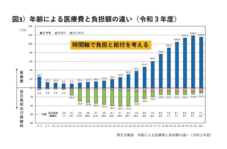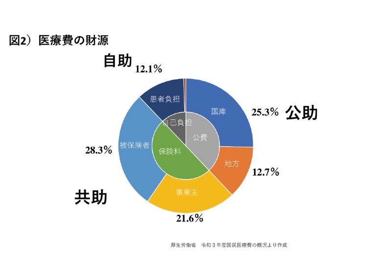 生島 図2をご覧ください。公費が38%、保険料は50%、その他12%のほとんどが患者負担となっており、6割以上は自身で賄っているといっても過言ではありません。増加していく医療費に対応するには、自助=患者負担、共助=保険料、公助=税の3つの選択肢しかないので、年齢にかかわらず応能負担を徹底する必要があるかと思います。