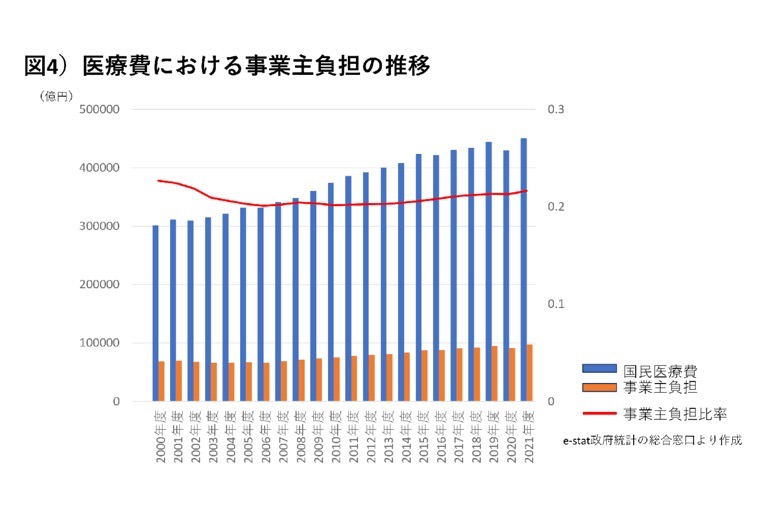 生島 確かに年齢が高いほど平均的な医療費は高くなる一方で、保険料の負担額は現役世代が高くなります(図3)。しかし、若者VS高齢者という区別で世代間対立を煽り立てるのではなく、就労期~高齢期というすべての人が通る時間軸で考えるべきです。社会保障制度があろうとなかろうと、古今東西、そして未来も就労者が非就労者を養っていくのは変わりありませんから。日本維新の会が「現役世代から高齢者への巨額の仕送り」と表現するなど、制度間の不公平の議論は常に出てきますが、社会保険制度自体が応能負担による相互扶助であることや、連帯のシステムであることを忘れてはいけません。しかし保険料に関しては、事業主・被用者折半とは言いながら、事業主負担分がだんだん減ってきています(図4)。事業主に負担をかければ製品に価格が転嫁され、経済力の低下につながるというようなことはこれまで繰り返し言われてきましたが、特に大企業で過去最高益が相次ぐ中、利益を内部留保するくらいなら更なる保険料負担は可能ではないでしょうか。