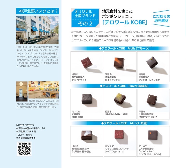 神戸北野ノスタのショコラティエがオリジナルボンボンショコラを開発。農園から直接仕入れたフルーツや地元の調味料などを使用し、「フルーツ」「調味料」「お酒」という3つのカテゴリーごとに3種類のショコラを詰め合わせ各1,480円(税別)で販売。
