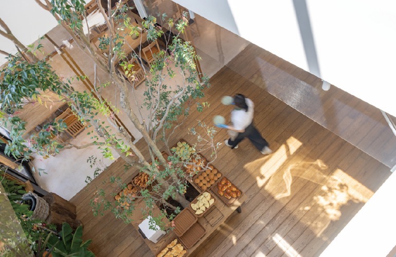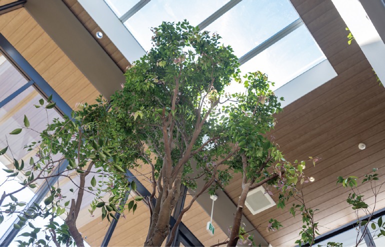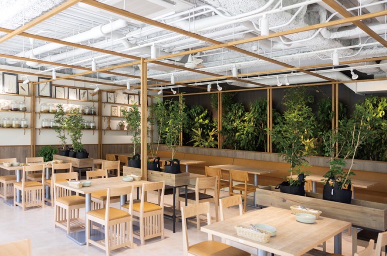 新棟は施設内の西側に竣工。その1階にオープンしたレストランは、エディブルプランツ(食べられる植物)など人間が暮らしに取り入れられる植物に包まれる空間。吹き抜けに植えられたシンボルツリーはクローブの原料となるシジギラムで、鹿児島、指宿の山からこのたびこちらに移したとか。