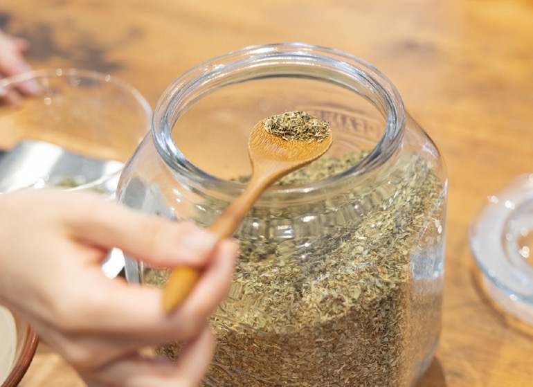2階にはキッチンがあり、ここではハーブショップの店長にして、「ハーブの魔女」と呼ばれているハーバリストの伊藤友美さん監修の体験メニューが楽しめる。屋外に出て実際に探して摘み取り、オリジナルのハーブボードを作成すれば新たな発見も。ハーブティーの試飲も嬉しい。他にもハーブソルトやハーブオイルづくり、庭の果実を収穫してのジャムづくりなどの調理体験も可能。単に面白いだけでなく、植物に関する知識を深めることもできる。