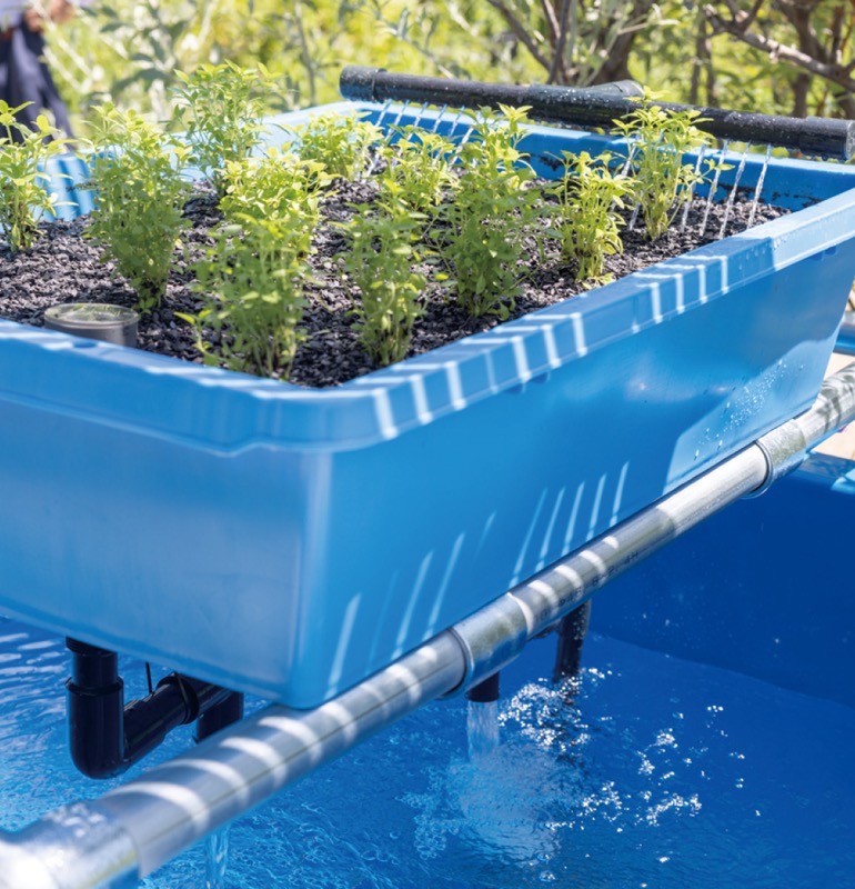 魚の飼育と野菜の水耕栽培を組み合わせた農法「アクアポニックス」にも取り組む。「食べる植物園」を含めNATURE STUDIOの運営を担うのは(有)リバーワークスの上戸了子さん(上)と事業主体(株)村上工務店の村上豪英さん(下)
