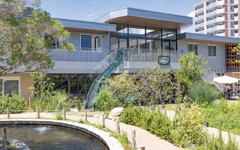 2階には介護と看護を一体化した看護小規模多機能型居宅介護を開設予定で、ショートステイの受け入れも計画中。また、2階のバルコニーから1階に降りるすべり台もあり、キッズの人気を集めそう。窓の外に遊ぶ子どもたちの元気な姿や声は、高齢者たちにとって何よりの〝心のハーブ〟になりそうだ。